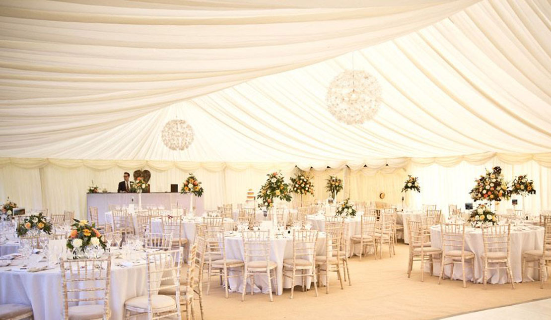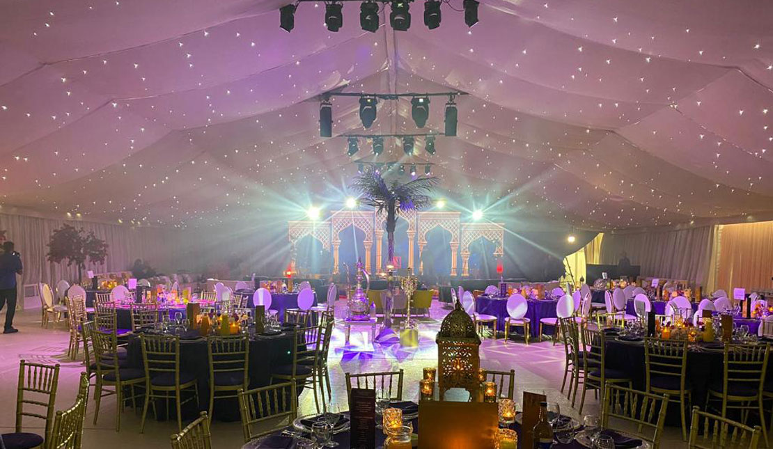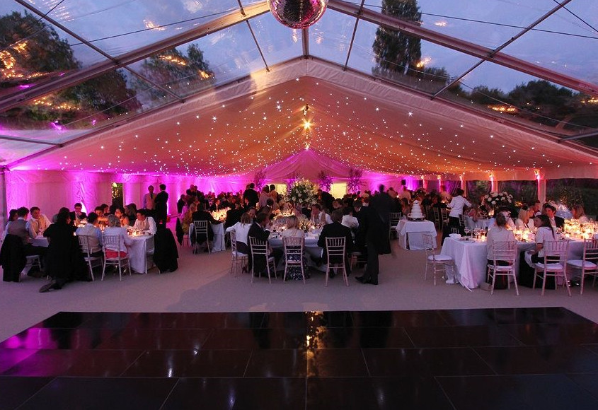Stunning structures, with luxurious drapery, lighting features, dancefloors, and seating options